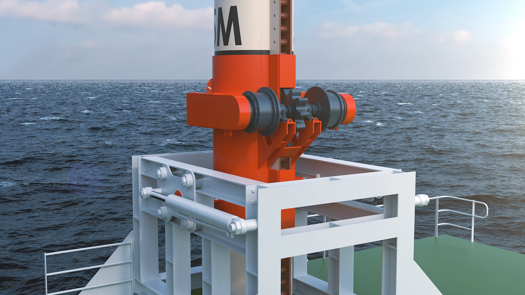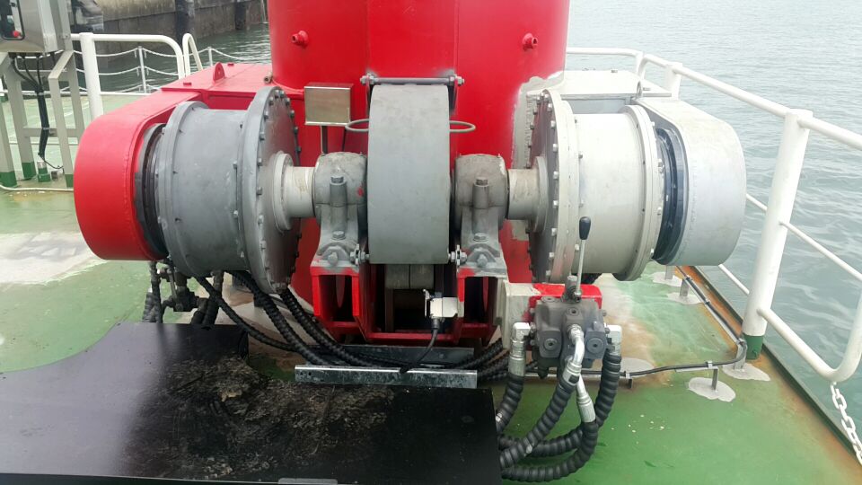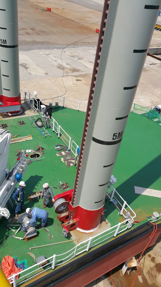- 스퍼드 케이스에 부착된 유압 모터와 감속기를 이용해 중앙부의 피니언 기어를 돌리는 방식으로, 스퍼드의 기울기와 각도를 조절해 바지선을 전진, 후진 시킬 수 있음